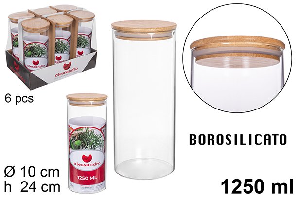 Bote Borosilicato Tapa Bambu 1250ml. Artículo de menaje para mesa y hogar: ideal para servir, presentar y disfrutar de bebidas o comida con comodidad. Material resistente y fácil de limpiar. Capacidad aproximada: 1250 ml.