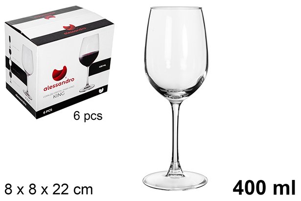 Copa Cristal Vino King 400 ml x6U. Artículo de menaje para mesa y hogar: ideal para servir, presentar y disfrutar de bebidas o comida con comodidad. Material resistente y fácil de limpiar. Capacidad aproximada: 400 ml.