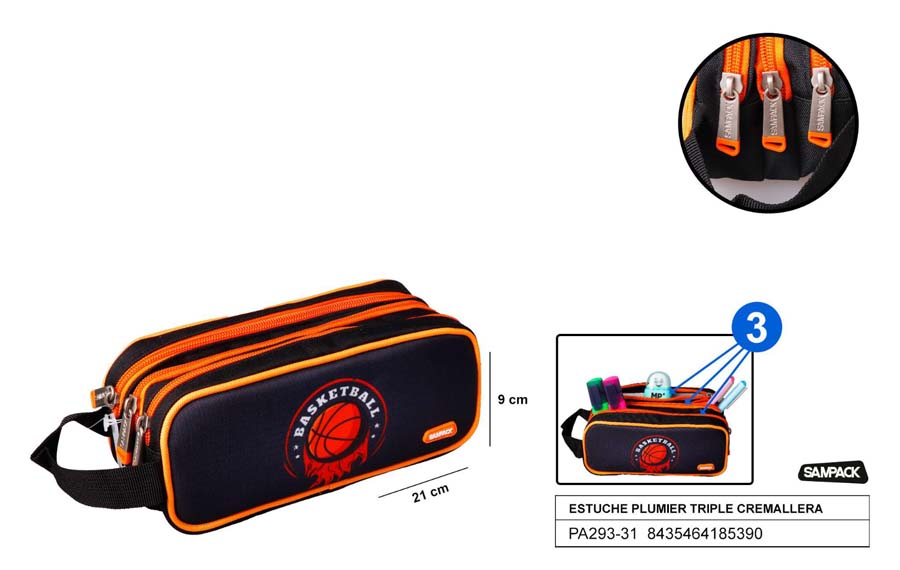 Estuche plumier triple cremallera, 21x9cm.